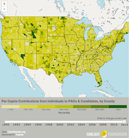 Earlier this month, Republican donor Shaun McCutcheon argued at the U.S. Supreme Court that his First Amendment rights are being violated by current limits on the total amount of money he can contribute to federal candidates. McCutcheon and the Republican National Committee claim that the Federal Election Commission's $48,600 limit on individual campaign contributions hinders wealthy citizens' right to support as many groups or candidates as they would like. But a new campaign finance study by the Sunlight Foundation and Azavea, a Philadelphia-based geospatial analysis firm, debunks this argument.
