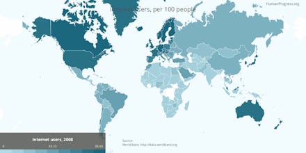 Today, only 39% of the world's seven billion people are connected to the internet at all — 30% of people in the developing world, 77% in the developed world. Looking back on 2008, I’d gone from the U.S., where 74% of the population was using the internet, to Ghana, where 4% was. Today, it's roughly 85% and 17%, respectively. There are more extreme ends of the spectrum: Finland's rate of connectivity is 98%; Eritrea's is less than 1%.