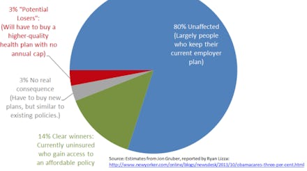 In bright bold colors, the chart shows that the vast majority of Americans (80%) will be entirely unaffected by the Affordable Care Act. Another 14% percent will gain access to affordable insurance that previously didn't exist. The last 6% of citizens is broken into two groups that are required to buy new insurance plans. Of these, 3% will need better plans with no annual coverage cap and 3% will need new plans with similar policies to their existing plans.