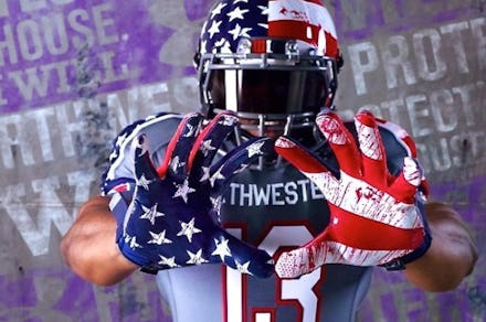 The uniforms are primarily grey, and boldly feature an American flag motif on the shoulder pads, gloves, legs, and helmets. Additionally, instead of players' names, the uniforms will display one of seven symbolic words: duty, honor, commitment, courage, service, integrity, or country. The most striking idiosyncrasy of Northwestern's new uniforms, however, is the blood spatter that highlights much of the uniform.