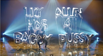 In Robin Thicke's music video for "Blurred Lines," he sings in front of a sign that says "Robin Thicke Has A Big Dick." In a pointed jab at Thicke, whose song has faced many accusations of objectifying women, Lily Allen dances in front of a sign that reads "Lily Allen Has A Baggy Pussy." Take that, sexism.