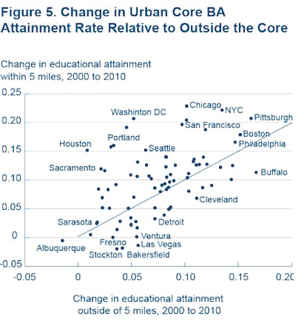 The above is a key chart that compares the change in educational attainment (the number of people with a bachelor’s degree) in various cities with those same cities’ suburbs.