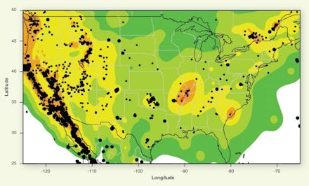 The map accompanied the USGS' "Man-Made Earthquakes Update," which reports that seismic activity in central and eastern states has increased dramatically over the past few years. Small black dots represent 3.0 magnitude earthquakes, while larger black dots mark quakes of magnitude 4.0 and greater. It turns out that those black dots are proliferating in unexpected areas (hazard levels are shown in color).