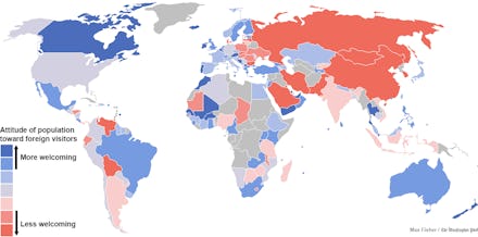 From the World Economic Forum's (WEF) "Travel and Tourism Competitiveness Report 2013," we now have the raw data, assembled into convenient map format by Max Fischer of the Washington Post. Red countries are the least welcoming towards foreigners, while blue countries are the most friendly. Strewn throughout the data are some interesting surprises.