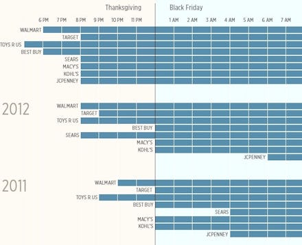 Just kidding! Instead, retailers have decided to outdo one another by opening earlier than ever: on Thanksgiving itself, a day that they're trying to give the scatological nickname of "Brown Thursday."