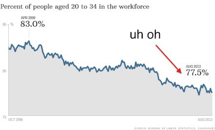The damning report comes courtesy of this chart, based on Bureau of Labor Statistics data. Interestingly, while that decline was accelerated by the 2008 financial crisis, it appears to date all the way back to the dot-com bust. The high mark, when 83% of people aged 20-34 were holding down jobs or looking for work, came in April 2000, and compares with a mere 77.5% of young people today.