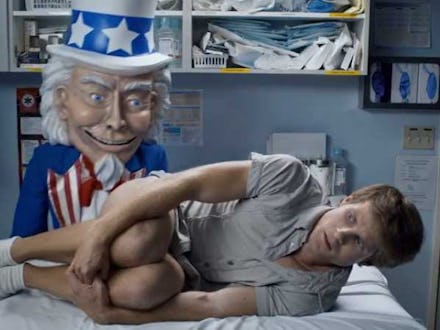 We can start with the most offensive of the bunch, a pair from the "Creepy Uncle Sam" series sponsored by the Koch Brothers' right-wing political group, Generation Opportunity. In one ad, "The Exam," we see a millennial girl who has signed up for Obamacare elevate her legs for what is presumably going to be a gynecological check up. As soon as her doctor steps out of the room, however, a grotesque Uncle Sam mascot suddenly rises up, his head first becoming visible as it emerges from the foreground between her legs. Cue the girl squealing in protest, the screen text urging: "Don't let government play doctor. Opt out of ObamaCare [sic]," and the ad closing with Uncle Sam ominously widening a speculum.