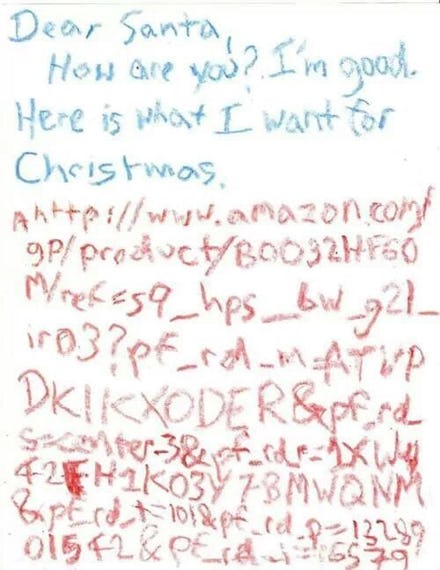 Here's what's going viral: A supposedly authentic image of a young child's note to Santa, asking for the toy he wants for Christmas. The twist? Instead of telling Santa what he wanted directly, he wrote out a 179-character (yes, we counted, give or take for childlike handwriting) URL to an Amazon page.