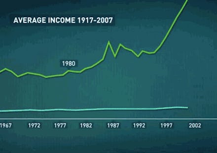 This GIF, created by BuzzFeed’s Dorsey Shaw from an animation in the PBS film Park Avenue: Money, Power, & the American Dream, shows a massive income inequality gap that has taken place in America over the past 30 years. The image makes it clear just how quickly the wealth of the top 1% of earners came to dwarf the stagnant wages of, well, the rest of us.