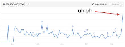 As story after story about historic financial milestones makes the news, beleaguered Americans are increasingly wondering if our still-recovering economy is already growing a formidable new bubble. The proof? Google searches for "stock bubble" have suddenly hit an all-time high, as can be seen in this Google Trends chart.