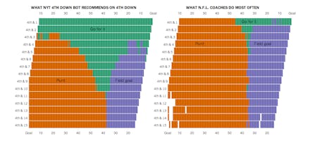 Far too often, coaches opt to punt or kick a field goal when they should be going for the first down. The bot even suggests going for it on fourth down with 11 yards to go on the opponent’s 38-yard-line. Even starker: the bot recommends going for it every time on fourth-and-1 and fourth-and-2, no matter where the team is on the field. That’s quite the departure from reality, where teams go for it less than half the time on fourth-and-1, and far less often on fourth-and-2.