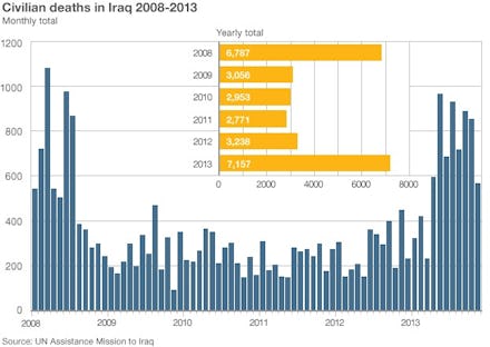 There have been more Iraqi civilian deaths in 2013 than any year since 2008. More than 2011 and 2012 combined, 7,157 civilians have been killed in Iraq since January this year. Check out the chart from BBC below: