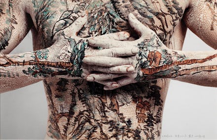 The Written Word presents works like Wu Shanshuan's "Character Image of Black Character Font" (above), which shows obstructed characters whose meanings are nonsense, and Zhang Huan's "Family Tree" (below), in which a number of calligraphers covered the artist's face with script until both the words and his face were obliterated. Traditional brush-written calligraphy in China is considered one of the highest forms of artistic expressions because it is both communicative and aesthetic. These artworks upend the inherent power of the written word by turning it into a pure stroke of expression, thus stripping it of meaning.