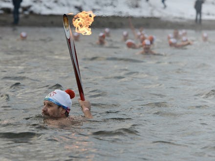 It's not just the men in Russia who seem to have incredibly good circulation and thick, heat-insulating skin. Here's torch-bearer Natalia Usacheva exiting the Yenisei River in Krasnoyarsk, Russia.