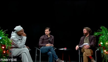 If you thought Between Two Ferns was going to bring on the holiday cheer for its "Christmas F-ing Spectacular," you were wrong. While Funny or Die's fake talk show, where host Zach Galifinakis attempts to make his guests feel supremely uncomfortable, doesn't quite embody the Christmas spirit, the episode strikes awkward gold with special guests Samuel L. Jackson (introduced as "Samuel L. Jack's son") and Tobey Maguire ("Toby"), and a bizarre musical performance by Arcade Fire (whose name Galifinakis doesn't even remember).