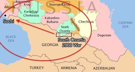 Sochi is located in Russia’s southwest, sitting scenically on the Black Sea, barely a rocket flight away from the Georgian border and the still-tense breakaway Republic of Abkhazia (the Olympic park is less than five miles from the border). Why does this matter? Because odds are good that Abkhazia and northwest Georgia more generally are a ticking terrorist time bomb that was set back in 2008, waiting for the Sochi games to go off.