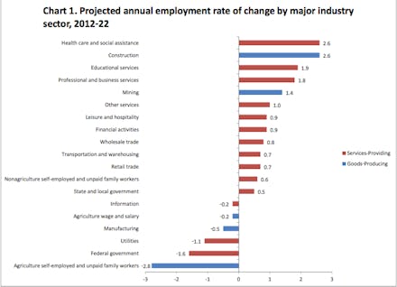 So which industries have the best forecasts? The health care and social assistance industry will see a 2.6% annual increase in employment, meaning an estimated 5 million jobs will be added by 2022. According to the BLS report, this “accounts for nearly one-third of the total projected increase in jobs.” Construction, too, is projected to have a 2.6% annual increase, adding 1.6 million new jobs. But the only other goods-producing industry with a positive annual change is mining, at 1.4%.