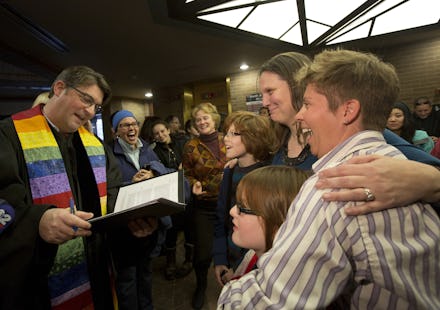 You see, Utah is among the reddest of red states. According to Gallup, Utah is the fifth most conservative state in the U.S., and the most Republican state (the difference: ideological identification versus party identification). It is by far the most conservative state to legalize gay marriage so far. Granted, the state itself didn't legalize it — there wasn't a measure put to voters — but simply the fact that same-sex couples can legally marry in the most Republican state in the country is a big freaking deal. And a sign of just how far things have come — and where they're going.