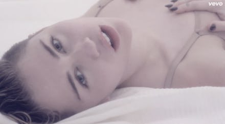 During the video's four and a half minutes, Miley writhes around on a bed under billowy sheets while wearing nothing but a bra and panties, before eventually moving to a bathtub and donning a fishnet bodysuit. The whole time Miley looks like she's just seconds away from, well, masturbating. Plus, the occasional appearances of a hand-held video camera and its grainy point-of-view add a delightful touch of depraved, bottomed-out, garbage porn.