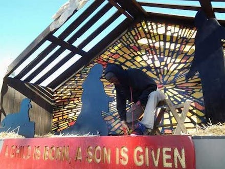 The nativity scene reads: “A Child is Born, a Son is Given.”