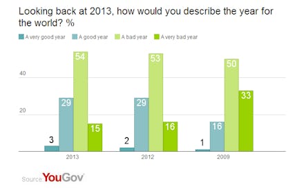 But this isn't exactly a new development. The same number of Americans — 69% — described 2012 as a bad or very bad year. And in 2009, a whopping 83% of Americans thought the year was a lousy one for the world (only 16% described 2009 as a good year, that's rough). Things have been bleak for a while. So 2013 isn't out of the ordinary — it's very keeping trend.