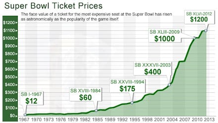 He has a point. The price of a Super Bowl ticket has been increasing rapidly over the years, with a sharp uptick in the past decade. The most expensive ticket in 2012 cost three times what it did in 2003. Check it out, courtesy of CBS and the Associated Press: