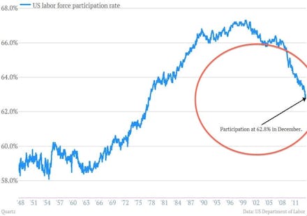 Yes. Except for the fact that November’s strong jobs report had economists looking for similar numbers in December. Unfortunately, the 74,000 jobs created represent just over a third of the 196,000 jobs that the economy was expected to produce last month. Worse, whether the weak report is due to frosty weather stymieing construction or to an underperforming health care sector, the fact remains that although the economy is adding jobs, fewer and fewer people are bothering to look for work, as can be seen in the below graph from the Bureau of Labor Statistics, which shows the percent of people 16 and older who participate in the jobs market.