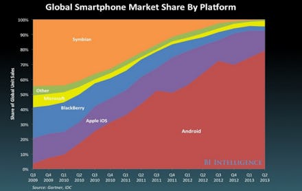 Of course, with conflicting data around the world, it's hard to get a definite sense of the market share, but either way, it's clear Apple's no longer dominating the smartphone market. Though sales of the 5s and 5c continue to grow, it's simply not enough to compete with the other platforms.