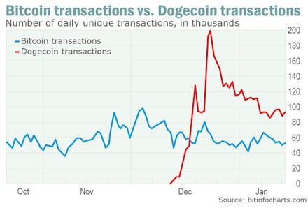 In other words, bitcoin is being used for big boy purchases and large-scale transfers, while dogecoin is primarily being used to transfer small amounts of money around the world. The dogecoin subreddit even has a bot that randomly hands out 100 dogecoins to users or instantly transfers them between users at their discretion.