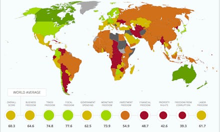 The big takeaway: "World economic freedom has reached record levels." Heritage has released the index for two decades, and global economic freedom is at an all-time high. Forty-three countries reached their peak economic freedom in this year's rankings, and 114 saw improvements over last year.