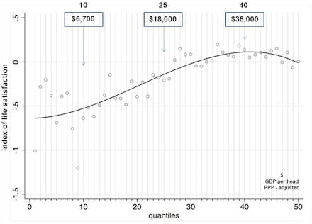 This is called the “bliss point” — the point at which happiness peaks. For Proto and Rustichini, that bliss point is around $33,000, but other research has found that there is no peak happiness as it correlates to GDP per capita — meaning that the richer you are, the happier you are, on and on and on. Nearly all research on the subject has found that a small increase in income goes along way for poorer countries. A tiny bump in GDP per capita leads to a large increase in life satisfaction in poorer countries, while the same size increase would lead to a much smaller rise in happiness for richer countries. Which makes sense: a bit of money is going to mean a lot more to a country that doesn't have a lot of it. For a rich country, it's just another drop in the bucket.