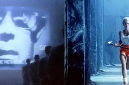 As the people march, a woman wearing a bright athletic uniform and carrying a large sledgehammer, is charging at the Big Brother-esque screen as the police chase her.