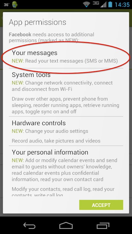 Hidden in an update that rolled out on Jan. 27, some other users reported that they saw this new permission request appear as soon as December. As Facebook grows, adds features, and seeks new revenue streams, it's been asking for more and more control of what goes on in your phone — but this bald-faced grab for your texts is the most blatant info-snatch yet.