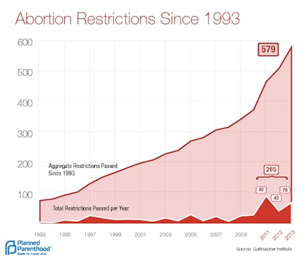 The background: The House’s vote comes as part of a larger, nationwide campaign to deal legal and accessible abortion a death by a thousand cuts. The below GIF from Planned Parenthood does a great job of illustrating the jump in state and federal restrictions on abortion passed since 2011, as part of a concerted conservative push against choice.