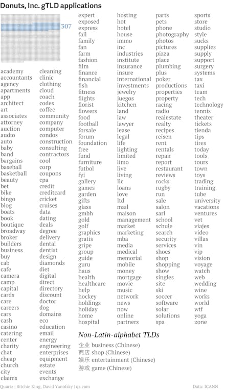 Companies like Amazon and Google are rushing to open new domains, but other companies like the $100-million Donut are looking to get in the game. Below are the 307 domains Donuts hopes to register: