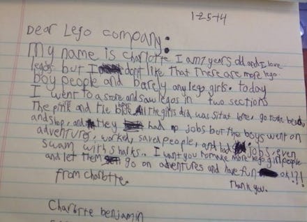 Lego might seem like a simple children's toy company, but a letter from a 7-year-old girl named Charlotte will open your eyes to a glaring problem within the company.