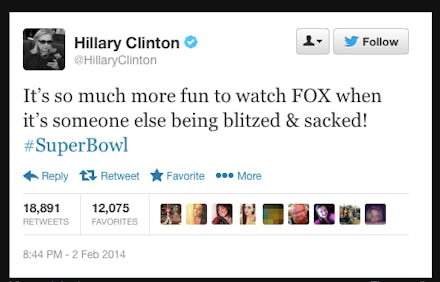 What she was likely referencing was a bizarre, tense, and one-sided partisan interview aired during the Super Bowl pre-game show, in which viewers watched as Clinton's former boss, President Barack Obama, defended himself against a barrage of conservative criticisms that were entirely unrelated to anything else in Fox's Super Bowl telecast. (Watch the interview here.)