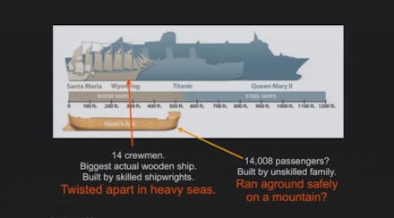 But Nye didn't stop there. He attacked the very idea of an Arc in the first place. "Another remarkable thing I'd like everybody to consider. Inherent in this world view is that somehow Noah and his family were able to build a wooden ship that would house 14,000 individuals ... And they had to feed them, and I understand that Mr. Ham has some explanations for that which I frankly find extraordinary [vegetarianism among lions]."