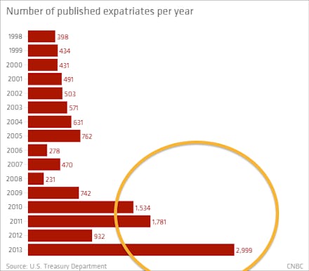 According to the Treasury Department, a record 2,999 Americans gave up their U.S. citizenship in 2013 — the highest number ever recorded. Many of them are believed to be rich "taxpatriates," people who gave up their U.S. citizenship because taxes are too damn high.