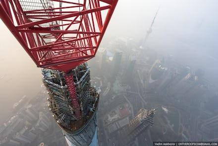 Now take a deep breath. Earlier this week, in the wee hours of the morning, the Russian daredevils donned facemasks, backpacks and a couple of cameras and climbed to the top of the Shanghai Tower in Shanghai, China. The tower is still under construction, but upon completion will stand approximately 2,073 feet tall, making it the second-tallest building in the world behind the Burj Khalifa in the United Arab Emirates.