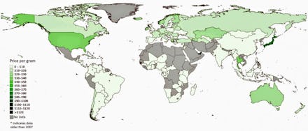Thanks to PriceOfWeed.com, you might already know how much the fair trade value of some real primo dank is in your neighborhood. But for the international value, you're going to need to need to turn to the real experts — the United Nations' Office on Drug and Crime, which tracked the average worldwide price of cannabis in its 2013 World Drug Report.