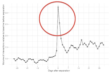 Need a hug much? The graph shows a staggering 225% spike in activity as the breakup occurs, followed by a week-long stabilizing period that ends with higher levels of activity compared to your "relationship" self. The Facebook Data Science series attributes this to "people receiving support [from] their friends in times where they need it, whether it comes in the form of private messages, timeline posts or comments."