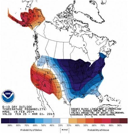 This six-to-ten day forecast shows the expected temperatures across the country — the dark blue area indicates where it will be colder than average: