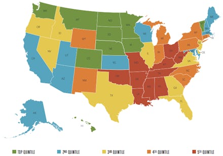 According to the Gallup Well-Being Index, the most miserable states in America are all concentrated in a bloc that runs from the Midwest to the South. See for yourself on the map below (the bright red area indicates the bottom quintile of states):