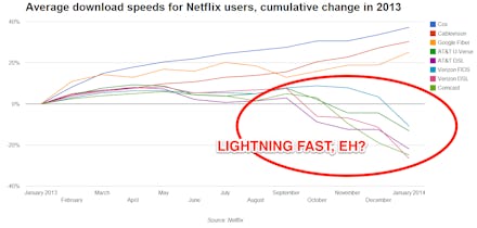 And soon, it seems very likely that either company will continue to forestall improving their networks in favor of throttling service and offering premium access to the companies willing to pay for it. While this might end up ultimately benefiting Netflix in the long term by making their customers' experience faster and more enjoyable, it's an unequivocal disaster for anyone who hopes to compete against their service without shelling out protection money to de facto cable monopolies.