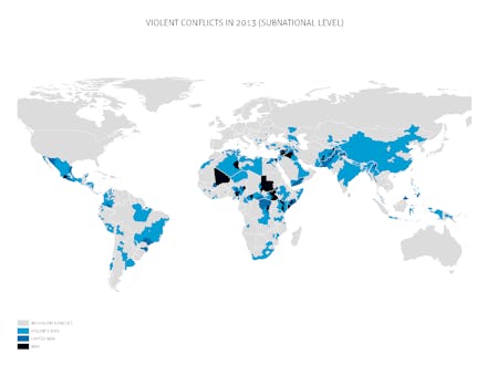 Last year was not particularly peaceful: As this map via the Heidelberg Institute for International Conflict Research shows, 2013 saw everything from riots, civil and military insurrections, to coups, drug violence and all-out civil war.