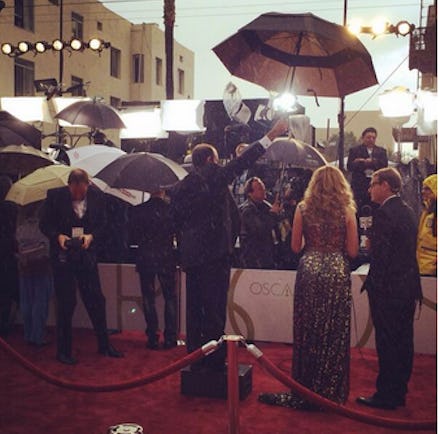 Los Angeles is not used to rain, but Oscar Sunday seems to be one of those rare less-than-perfect days. After the threat of rain loomed at about 30%, the Academy Award team decided to take down the tents that were shielding the red carpet: cue rain.