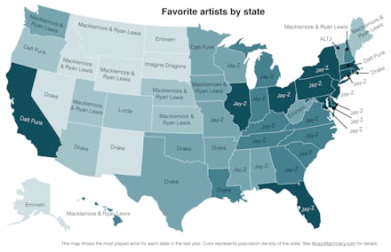 Interestingly, the only woman featured on this list is Lorde (in Colorado). For all the talk of empowering female pop stars, this stat speaks coldly to a larger gender gap in the music industry. But as for the rest of the non-Jay-Z, Macklemore and Drake country, top 40 hits like Daft Punk and Imagine Dragons reign supreme ... and somehow British band alt-J took over Vermont. If you've got any theories on that one, let us know.