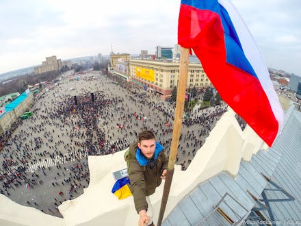 In three YouTube videos and the Insta-ready photo above, he depicts a crowd of Russian Ukrainians overpowering guards in Kharkiv, Ukraine's public offices, before climbing to the roof and raising the Russian flag. The photo captures Mika in a heroic pose, resting his boot over the downed Ukrainian pennant with the main square in the background. He added the following post to his personal blog later in the day.