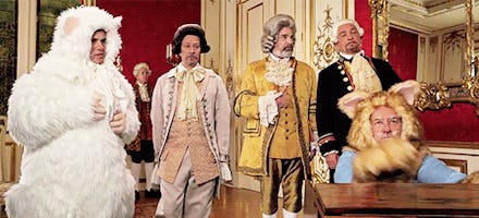The third features the most ridiculous cast by far, starring some of the greatest thespians of our age: Kevin Spacey, Christoph Waltz, Sir Ben Kingsley, Gary Oldman and Mandy Patinkin. Introduced by Anjelica Huston, "Ameowadeus" — a parody of the 1984 Milos Forman film — pits Spacey and Waltz against each other as bitter musical rivals, "Keyboard Cat" and "Hamster on a Piano." Kimmel himself has a memorable cameo as "Dramatic Chipmunk":